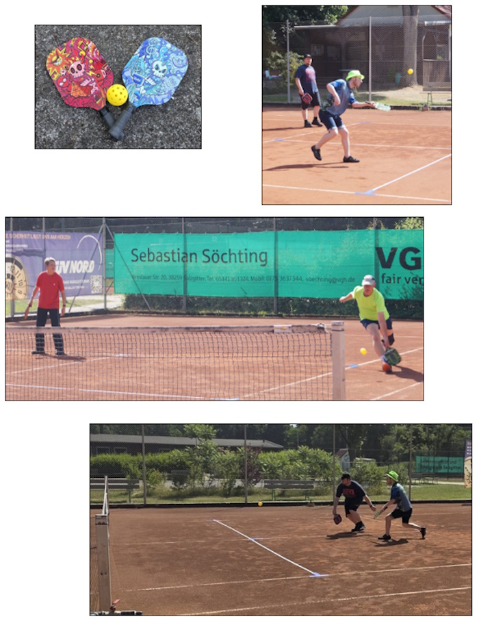 Am 22.06.2025 traf sich die Tischtennisabteilung zum diesjährigen Pickleballevent. Zum Wetter müsste man wahrscheinlich sagen „Amaterasus Werk und Kagutsuchis Beitrag“, denn der Himmel strahlte feurig auf die Tennisplätze ein. Doch trotz Temperaturen Jenseits der 30 wurde den Bällen hinterher gerannt und kein Punkt verloren gegeben. Auch wenn die Beteilung in diesem Jahr nicht so groß war, hatten die Teilnehmer viel Spaß. Für eine Erholung sorgten ein paar kalte Getränke aus dem Tennisheim, außerdem wurde auch die Bretonische Sportart Palet Vendéen im Schatten gespielt. Nach reichlich Sport gab es dann eine wohlschmeckende Mittagspause mit türkischen Spezialitäten. Während einige noch verdauten, bekamen andere gar nicht genug und so folgte auf die Pause noch ein paar weitere Runden Pickleball.