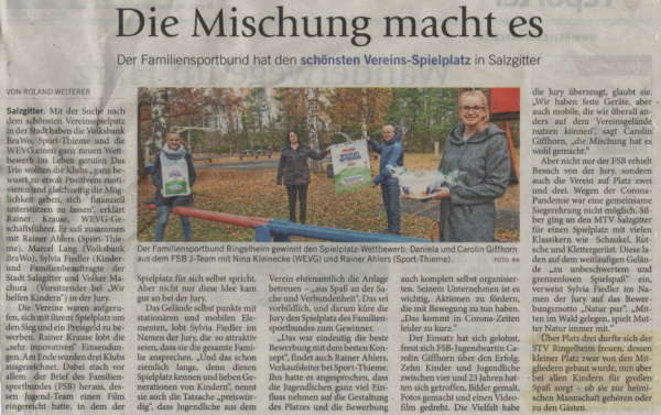 Beim Wettbewerb der WEVG um den schönsten Vereinsspielplatz hat der STV Ringelheim teilgenommenen. Wir haben uns sehr gefreut, dass unser, doch eher kleiner Spielplatz, bei der Jury punkten konnte. Am Ende belegten wir den dritten Platz. Neben einer Urkunde gab es auch einen Gutschein, der gut für die weitere Instandhaltung genutzt werden kann.