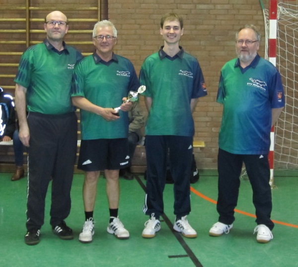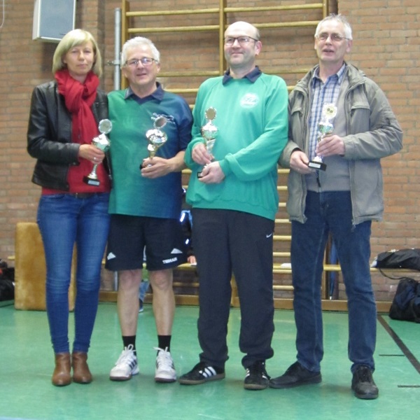v. l. Barbara Bartels, Martin Exner, Bodo Hoffmann und Christian Zyzik nach der Pokalübergabe. Die anderen TT-Spieler erhielten ihre Pokale bereits bei den Vereinsmeisterschaften.